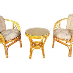 Комплект из натурального ротанга, состоящий из двух кресел и круглого столика с плетеной столешницей. Стекло входит в комплект.