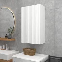 Белый шкаф с рифлёным фасадом будет отлично и стильно смотреться как в ванной, так и в туалете.